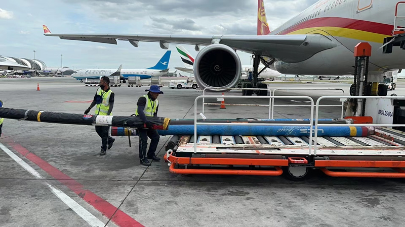 地面保障人员进行超长体育器械行李装机工作。新华网发