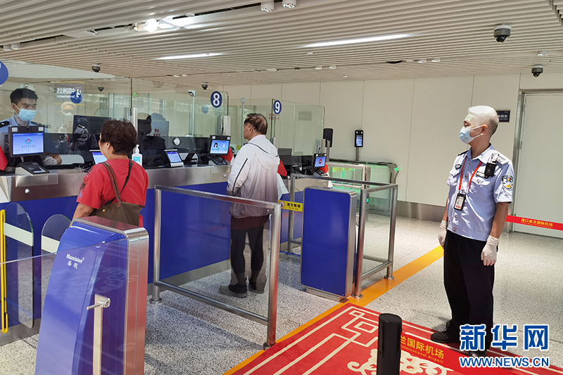 美兰边检站民警余强正在指引疏导前台旅客。新华网发