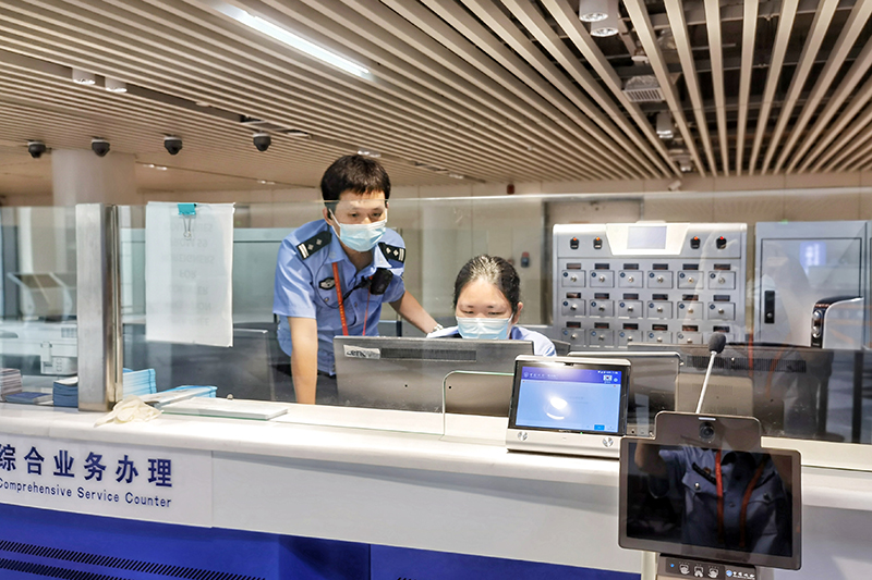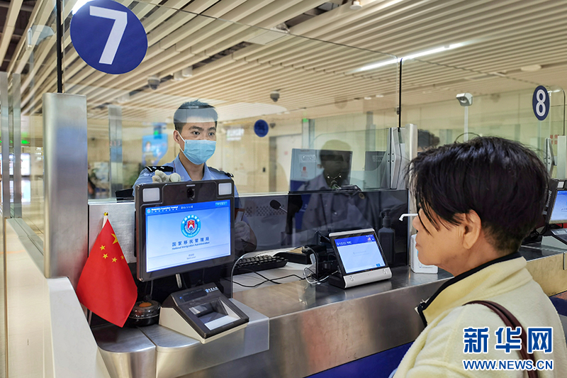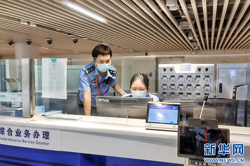 美兰边检站民警丁俊权正在为旅客办理边防检查手续。新华网发