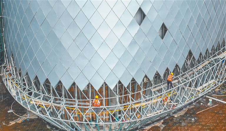 近日,海南省非物质文化遗产展示中心项目建设现场,工人进行收尾阶段的外部幕墙安装。目前,该项目公共区域内部装修和公共区域机电设备安装工程已完成96%,整体项目预计年底完工。