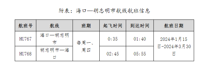 海南航空海口—胡志明市国际航线于2024年1月15日开通运营,每周执行2个往返航班,班期为每周一、周四,去程航班计划于北京时间0时35分从海口美兰国际机场起飞,当地时间1时40分抵达胡志明市新山一国际机场,飞行时长预计2小时5分钟;返程计划于当地时间2时45分从胡志明市新山一国际机场起飞,于北京时间5时55分抵达海口美兰国际机场,飞行时长预计2小时10分钟,以上航班信息以实际查询为准。旅客可通过海南航空官网及APP、微信公众号及小程序、服务热线95339、各直属售票处及授权代理购买机票。(张瀚兮、杨映娟)