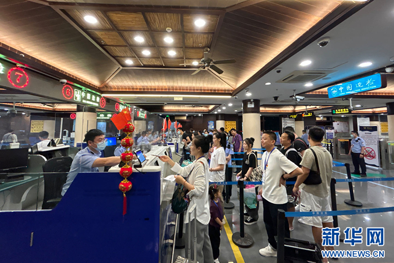 2月4日,乘坐邮轮航线的旅客正在排队办理出境边防检查手续。新华网发(丛高 摄)