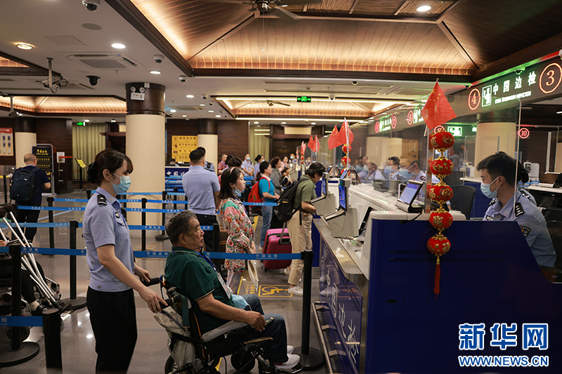 2月4日,三亚边检站移民管理警察协助老年旅客办理通关手续。新华网发(丛高 摄)