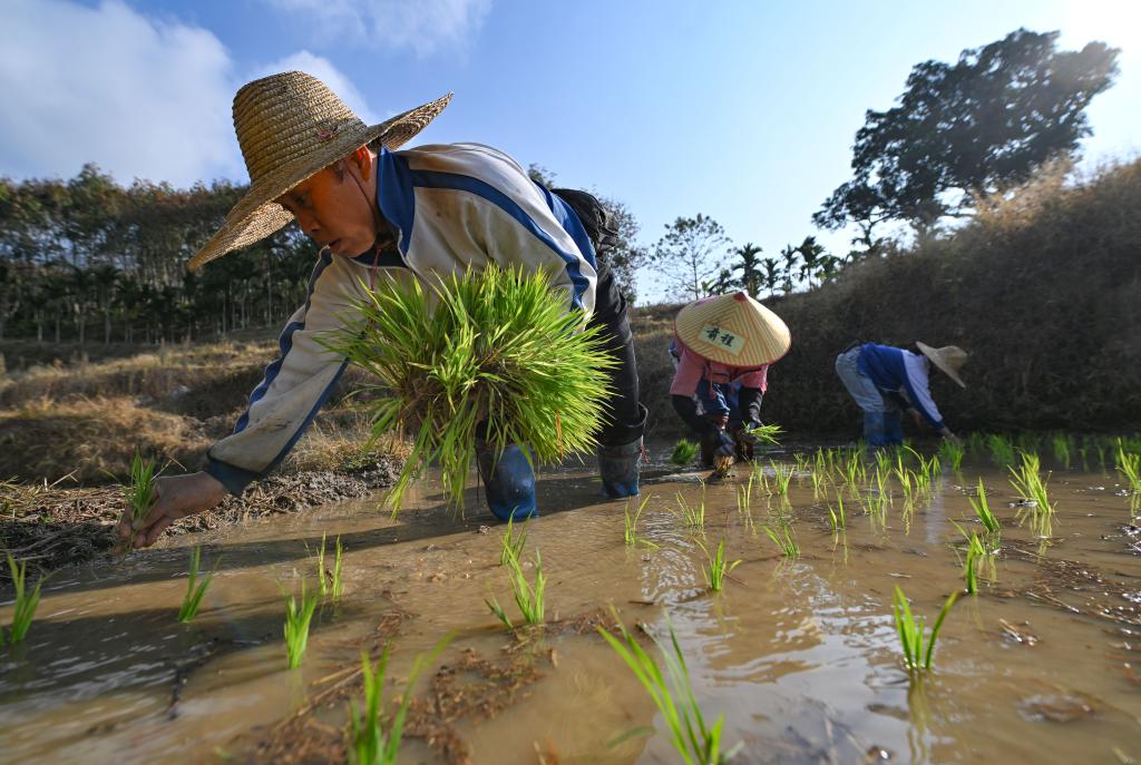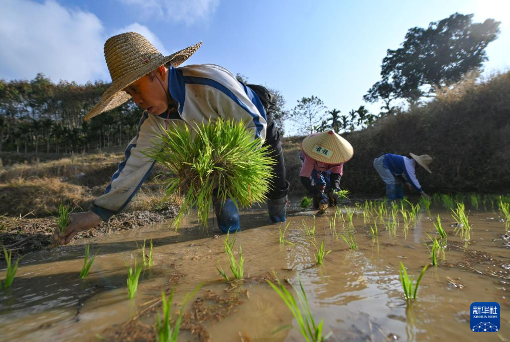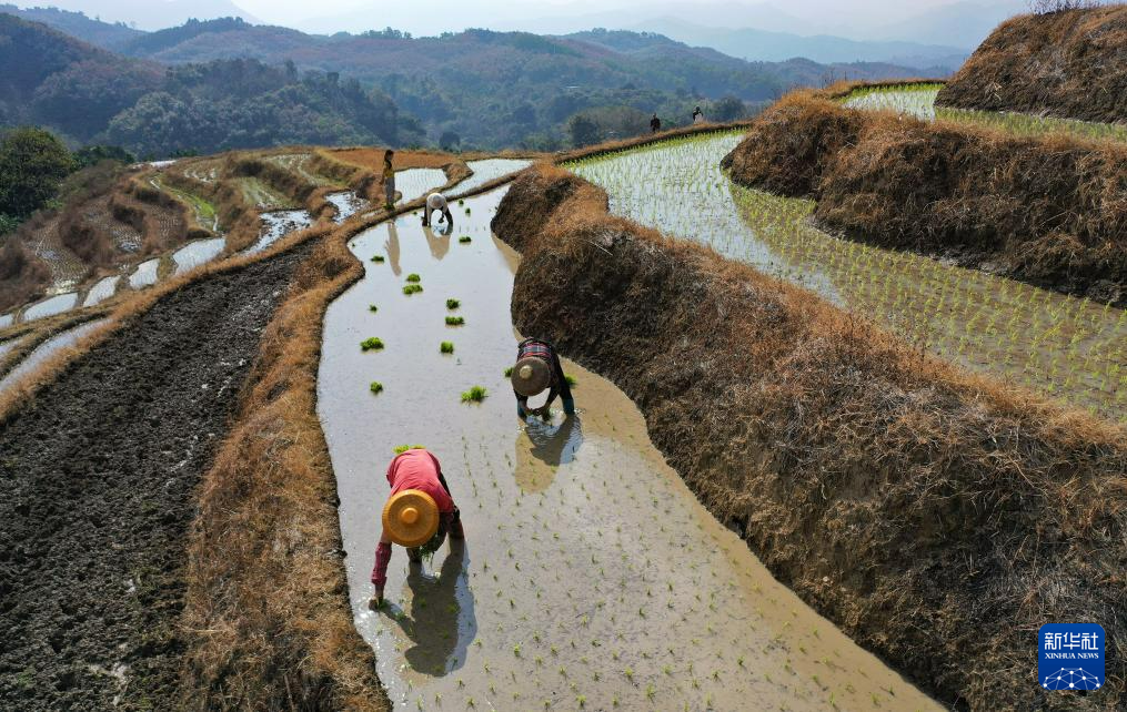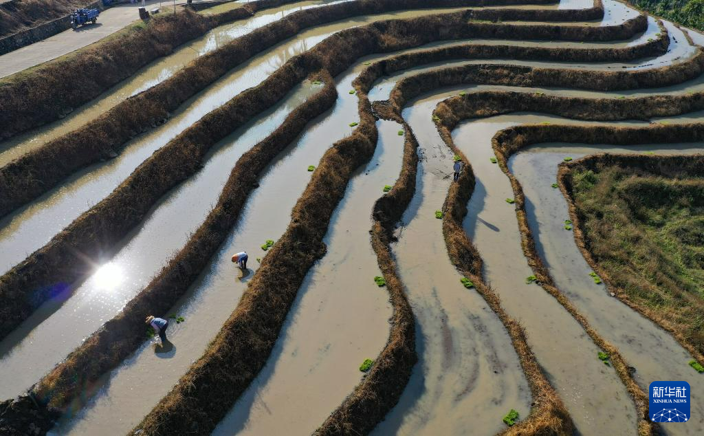 1月18日,农民在五指山市毛阳镇牙胡梯田插秧。新春将至,海南省中部山区的五指山已进入春耕时节。在五指山市毛阳镇牙胡梯田,农民们辛勤劳作,田间一派农忙景象。新华社记者 郭程 摄
