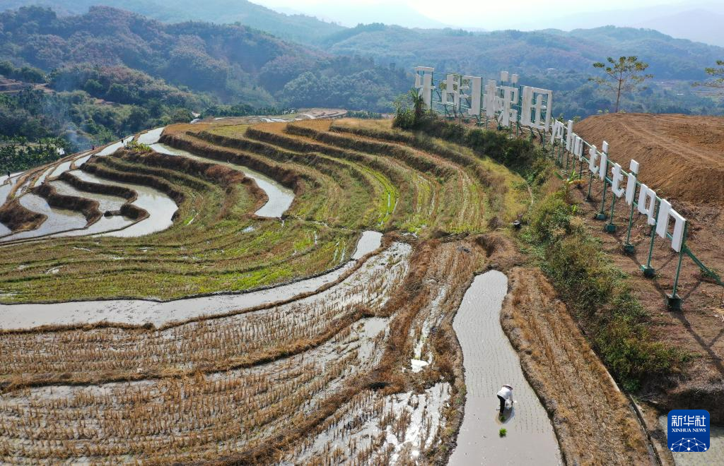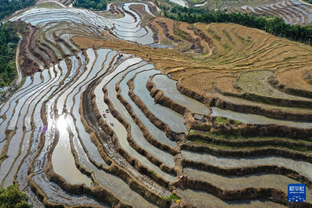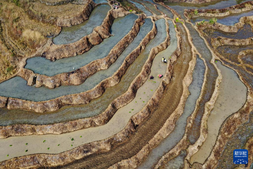 1月18日,农民在五指山市毛阳镇牙胡梯田插秧(无人机照片)。新华社记者 郭程 摄