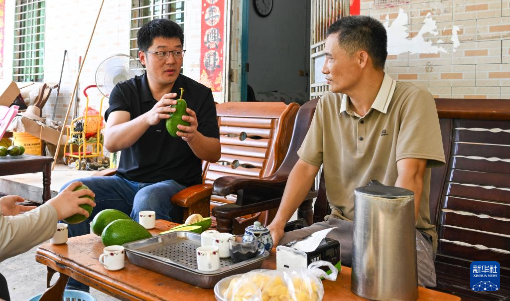 在海南省白沙黎族自治县荣邦乡一牛油果种植园附近,中国热带农业科学院热带作物品种资源研究所研究员王甲水(左)与种植户进行交流(8月13日摄)。新华社记者 杨冠宇 摄