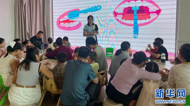 在家长小课堂环节,工作人员化身知识传播使者,通过生动的绘本分享,将护牙知识以有趣的故事形式娓娓道来;又借助直观的牙齿模型,进行细致入微的讲解。