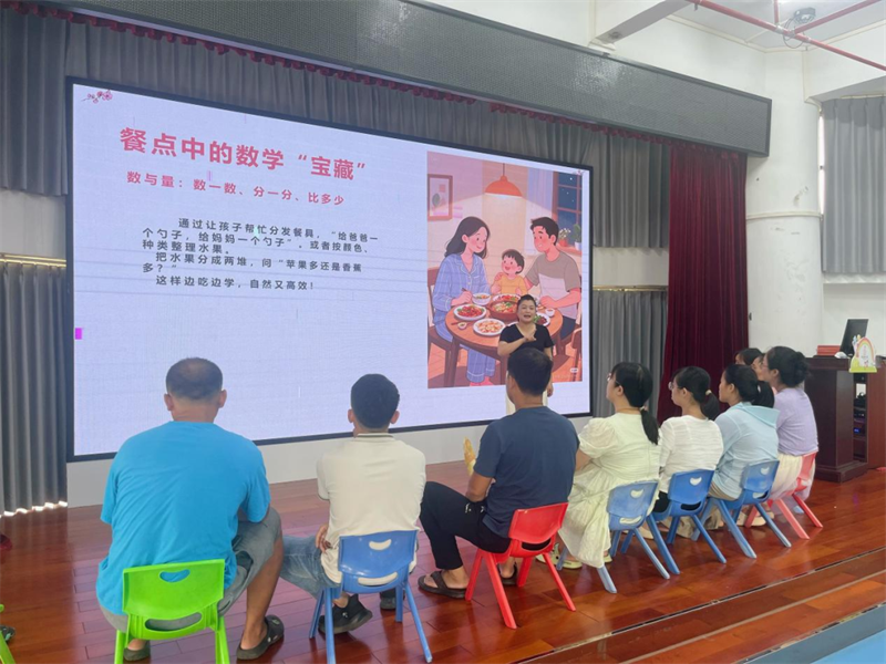 活动特别设置家长讲座环节,聚焦“如何将数学启蒙融入日常餐点”这一实用主题。讲师结合生活场景,讲解如何通过分水果(认识数量与分类)、摆餐具(理解形状与空间)、分配点心(学习简单加减法)等日常行为,将数学概念自然融入亲子互动,为家长提供了“生活即教育”的科学育儿方法。