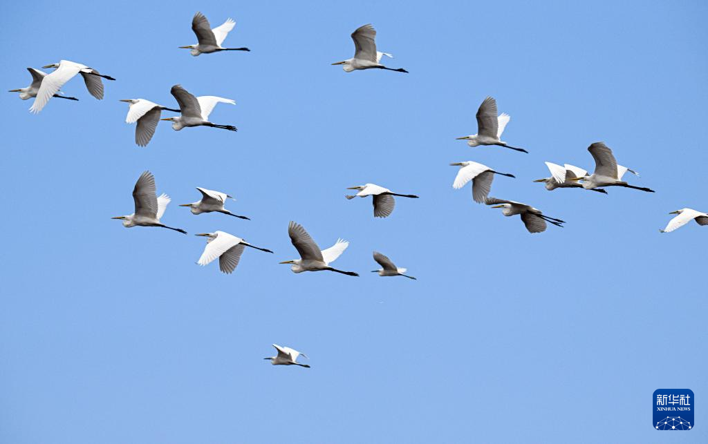10月2日,成群的鹭鸟飞翔在海南昌江海尾国家湿地公园上空。新华社记者 蒲晓旭 摄