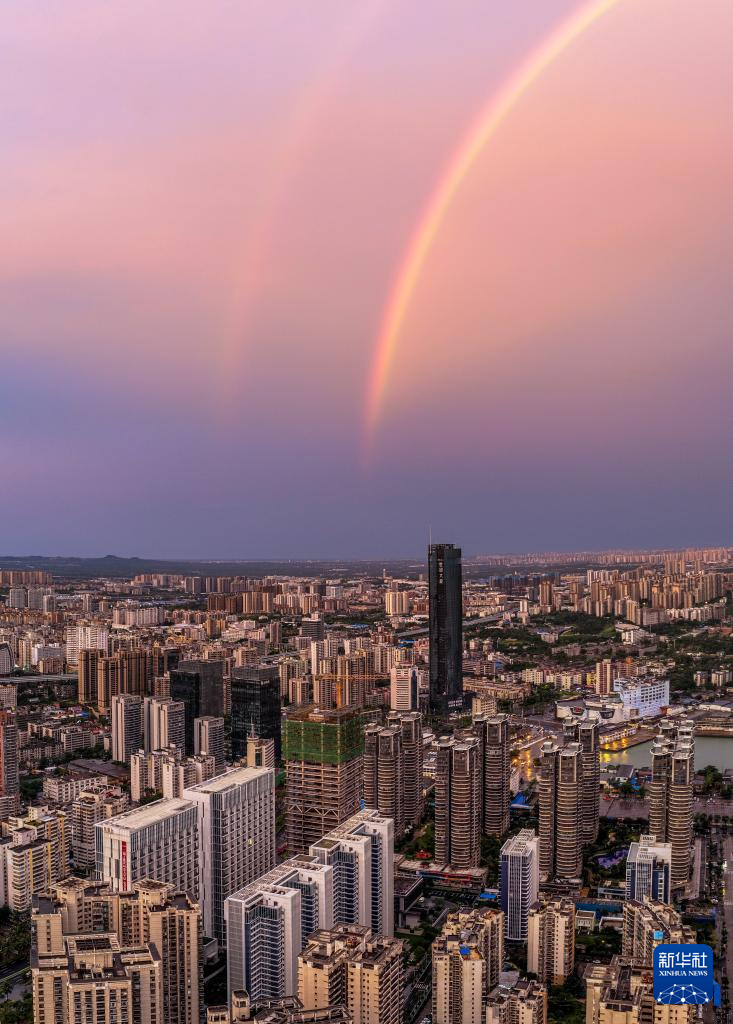 10月6日清晨拍摄的海口市上空的彩虹。新华社发(蒋聚荣摄)