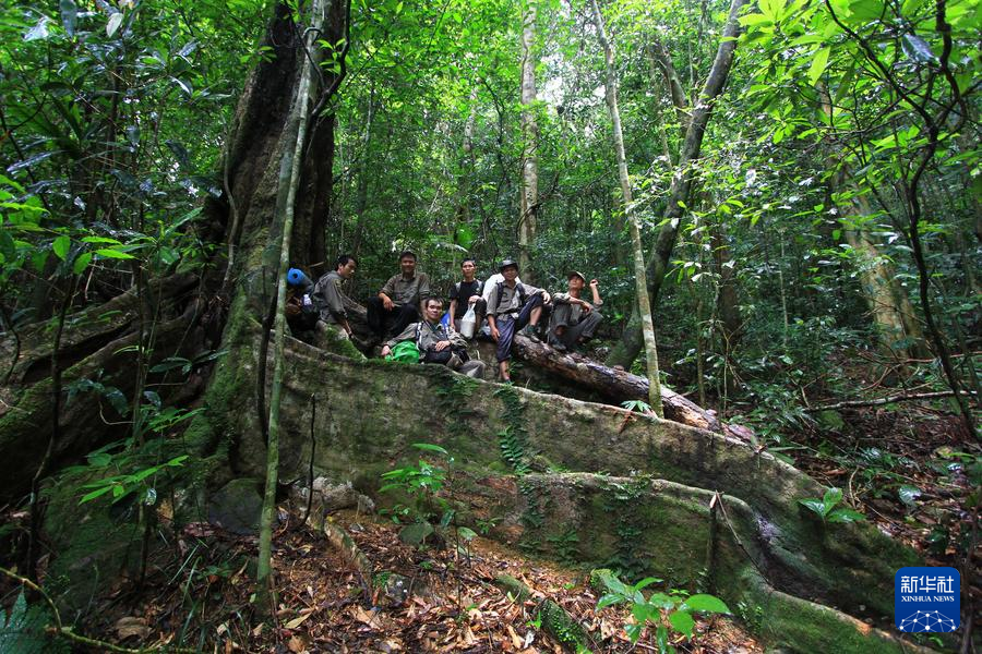 海南热带雨林国家公园护林员与“大板根”合影。新华社发