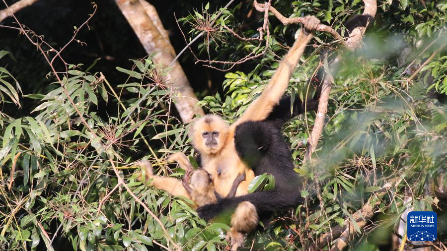 生活在海南热带雨林国家公园中的海南长臂猿一家。新华社发