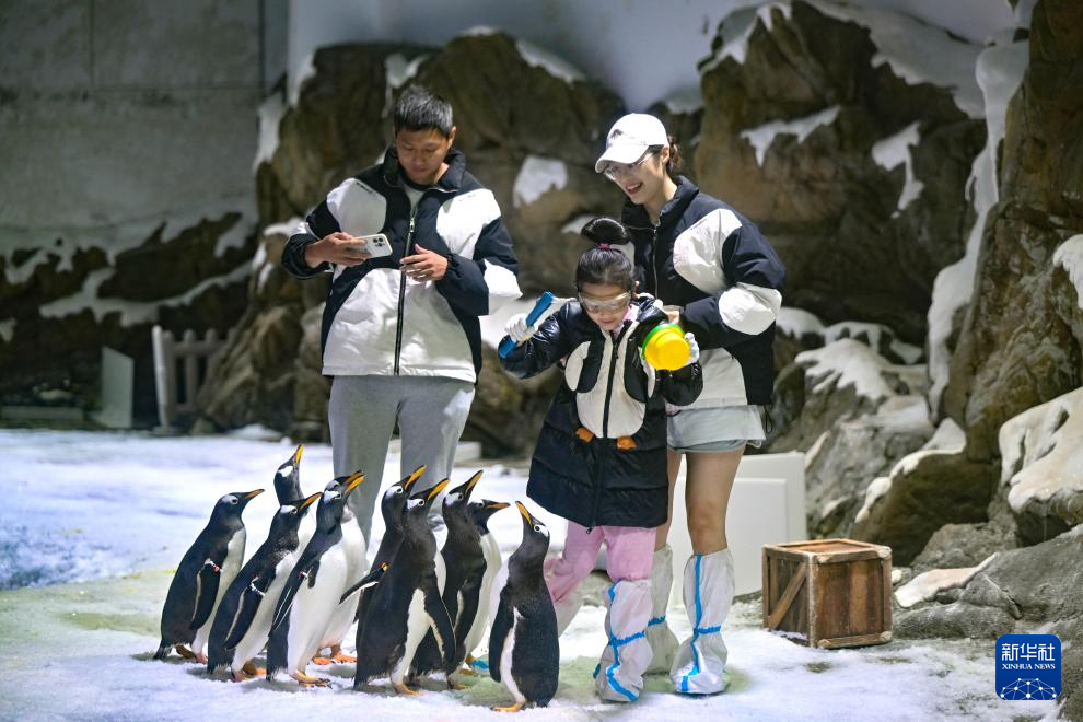 10月18日,游客在海南海洋欢乐世界度假区体验喂食企鹅。新华社记者 郭程 摄