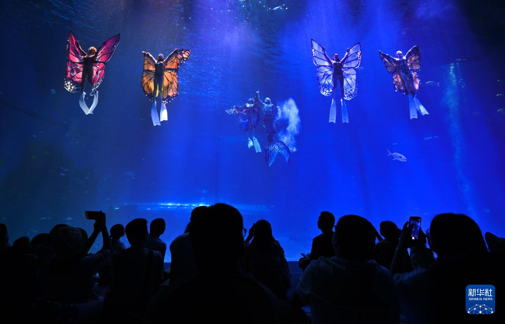 10月18日,游客在海南海洋欢乐世界度假区观看水下表演。新华社记者 郭程 摄