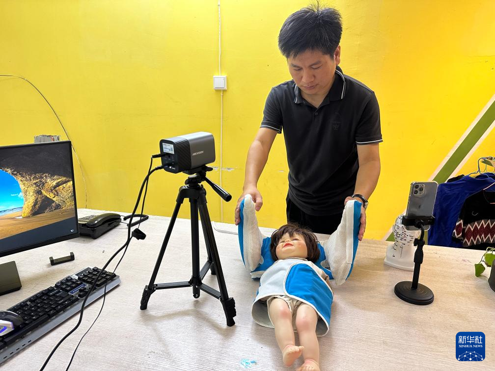 唐浩雄在短视频直播平台介绍他设计的婴儿连体枕。新华社记者 陈凯姿 摄