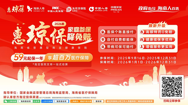 目前,“惠琼保”2026版正在参保中,海南省基本医疗保险参保人、海南省内定居且办理居住证的人员、具有海南本省户籍的人员、持有海南身份证的人员、海南挂职人员、被认定为海南省高层次人才的人员、新市民、灵活就业人员,上述人员均可关注官方参保平台“海南惠琼保”微信公众号,为本人及其父母、配偶、子女统一办理参保,也可以通过支付宝、海易办、海南农商行、云闪付、椰城市民云在线参保,另外还可以通过13家共保体公司的专业工作人员咨询参保,海南职工医保参保人可使用医保个账余额为已绑定家庭共济关系的父母、配偶、子女等近亲属投保。