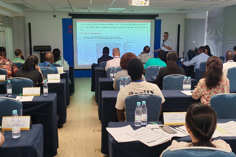 陈文彬采用全英文教学,综合运用案例式与研讨式方法,从法治和人治的比较,中国法治建设和降低犯罪率、贫困率之间的关系等进行讲授,并引导大家对法律建立真诚信仰,同时和学员针对如何从“5个体系”推动法治建设等展开交流。