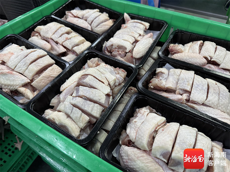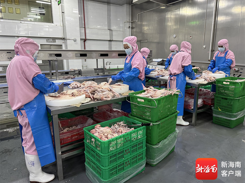 10月27日,在位于海口三江镇的潭牛文昌鸡屠宰加工场内,流水线上一派繁忙景象,工人们操作熟练地将宰净的光鸡进行切块、打包、装箱,这些宰杀好的文昌鸡将通过冷链生鲜运输至全国各大商超、餐饮门店,其中有一部分还将经过速冻锁鲜,运往新加坡。