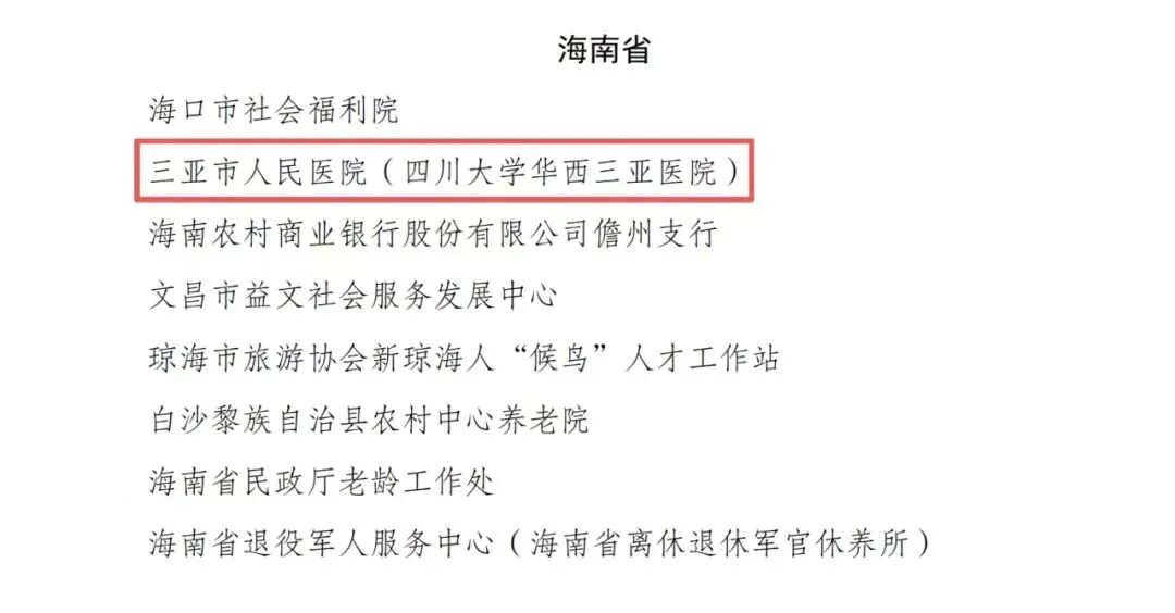 10月29日,全国老龄办公布了全国“敬老文明号”名单和全国“敬老爱老助老模范人物”名单,三亚市人民医院丨四川大学华西三亚医院获评全国“敬老文明号”称号。
