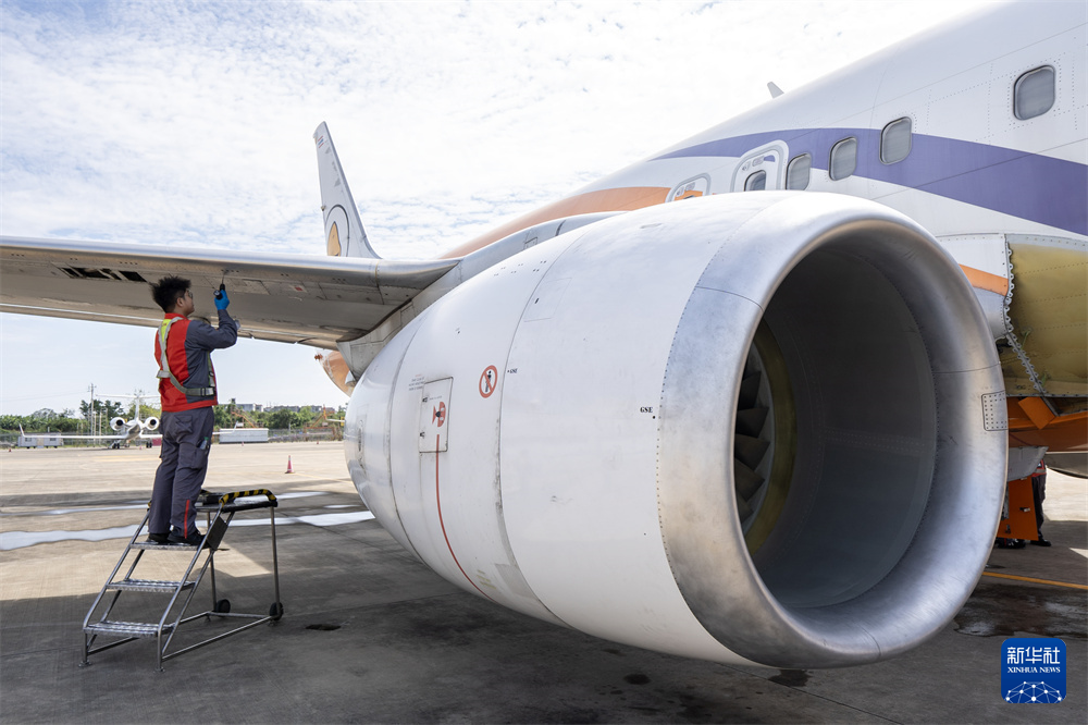 11月21日,海航技术旗下大新华飞机维修服务有限公司的机务维修人员对进境飞机进行检修。新华社记者 张丽芸 摄