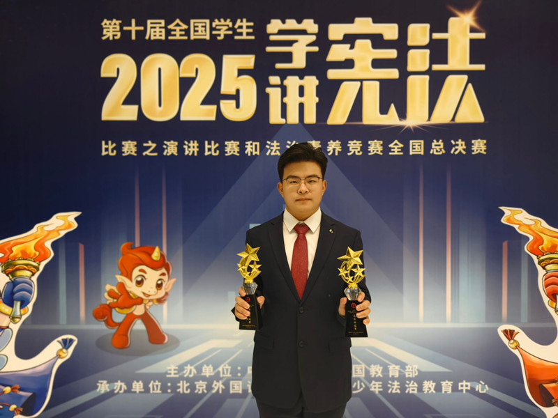 12月1日,第十届全国学生“学宪法 讲宪法”演讲比赛全国总决赛在北京落幕。海南大学法学院、椰风书院国际法专业2024级本科生崔子恒荣获全国高校组冠军、最佳表达奖。