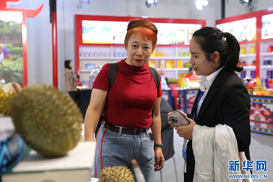 展销商为观众讲解保亭特色农产品榴莲。新华网 王雯君 摄