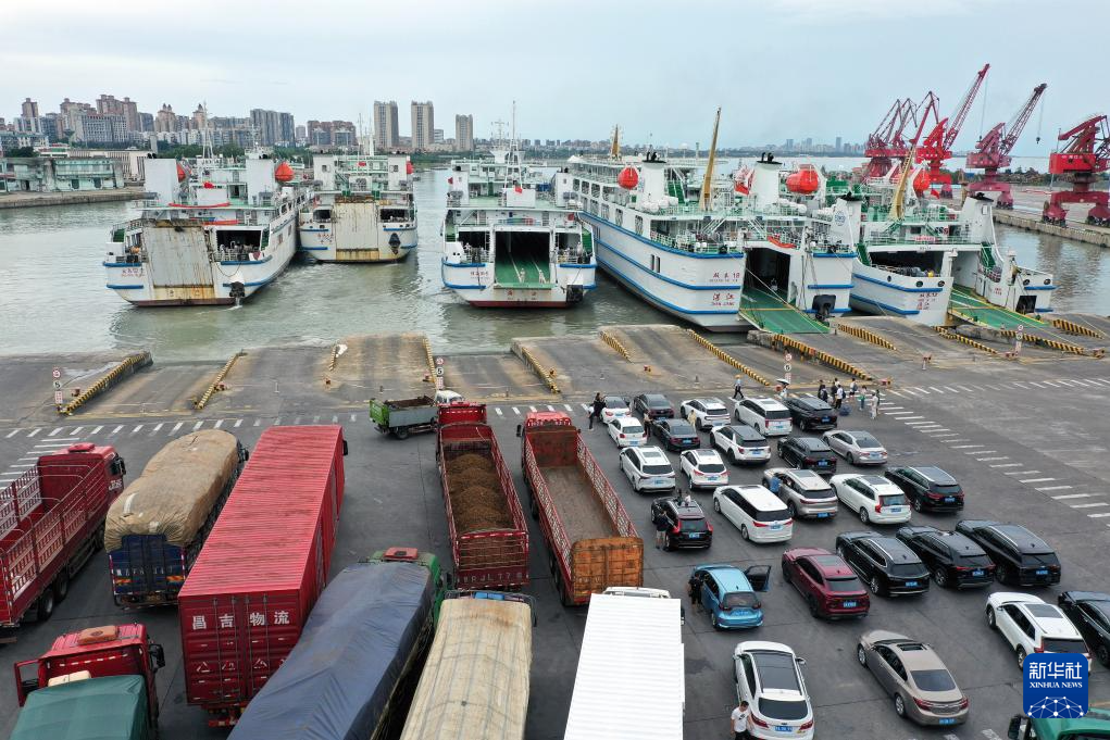 在海南省海口市秀英港,客滚船在装卸乘客、车辆(无人机照片)。新华社记者 郭程 摄