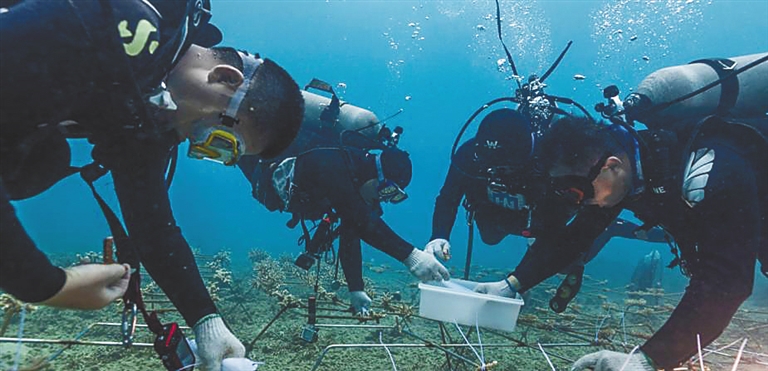海南大学师生进行珊瑚种植。