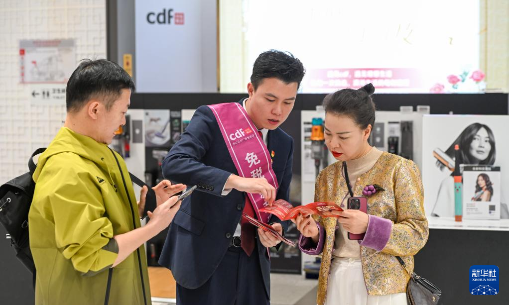 在中免集团海口日月广场免税店,工作人员在向游客介绍免税政策(1月1日摄)。新华社记者 杨冠宇 摄