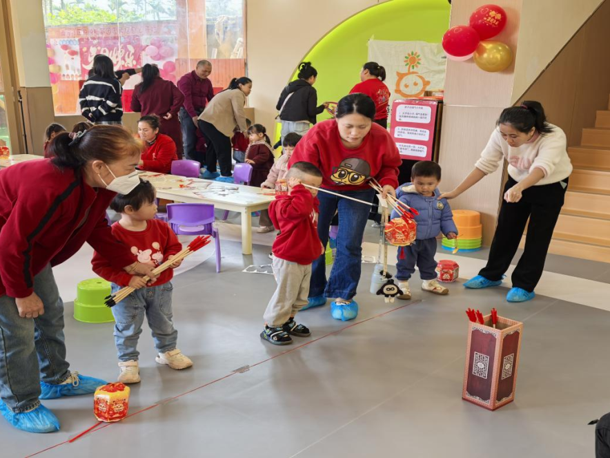 亲子游园闯关环节是本次活动的核心亮点。现场设置了福气拍照、新年灯笼DIY制作、传统投壶与套圈等多个趣味项目。孩子们在家长的陪伴和协助下,积极参与手工制作和游戏挑战,现场充满欢声笑语。活动在全体参与者合唱《新年好》的歌声中结束,现场还进行了合影,并为孩子们发放了伴手礼。