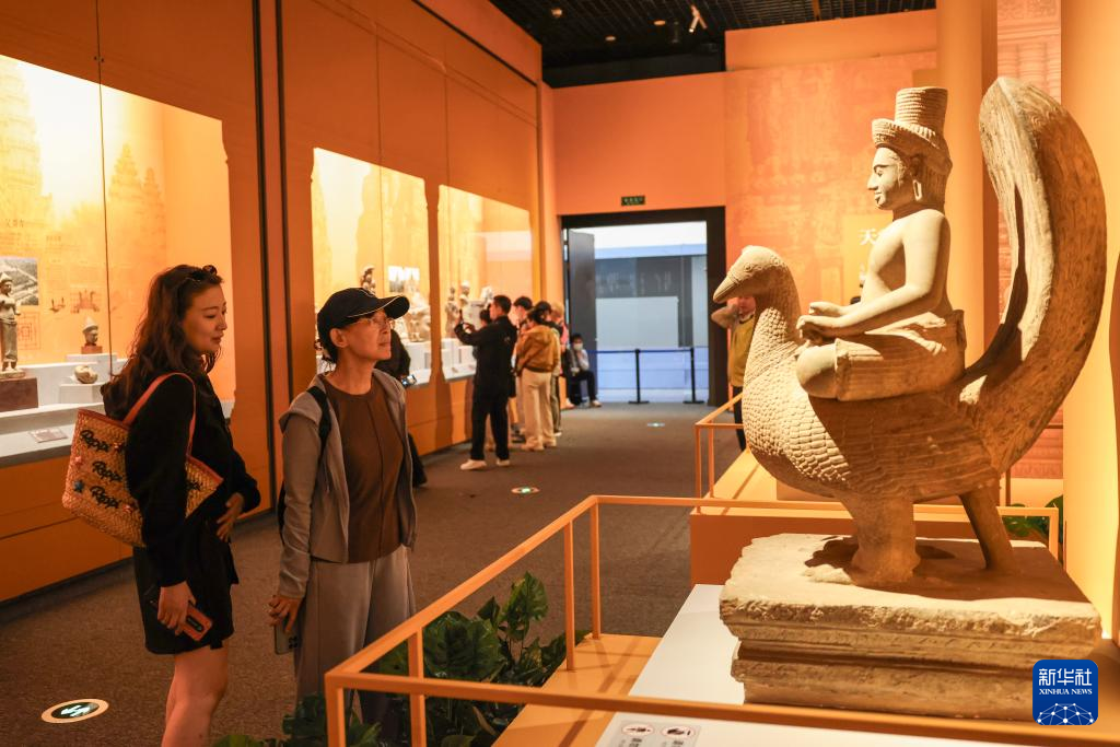 1月22日,观众在中国(海南)南海博物馆里参观“水与石的史诗——柬埔寨古代文明特展”。新华社记者 张丽芸 摄