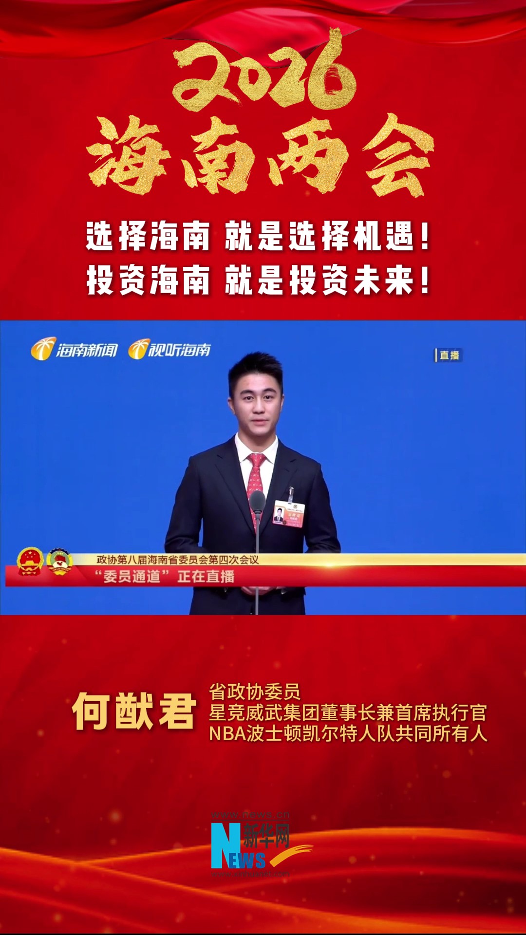 海南两会代表委员通道|何猷君:选择海南 就是选择机遇!投资海南 就是投资未来!-新华网