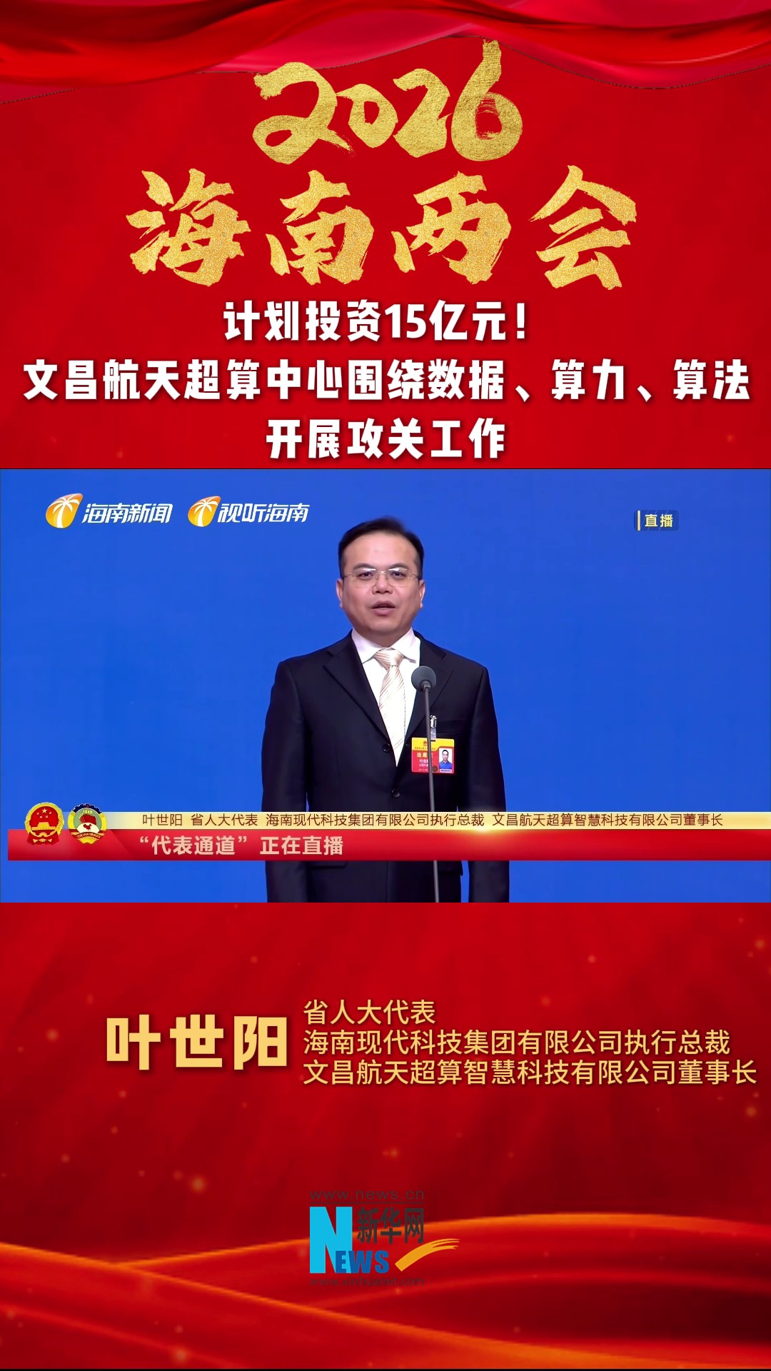 海南两会代表委员通道|叶世阳:计划投资15亿元!文昌航天超算中心围绕数据、算力、算法开展攻关工作 -新华网