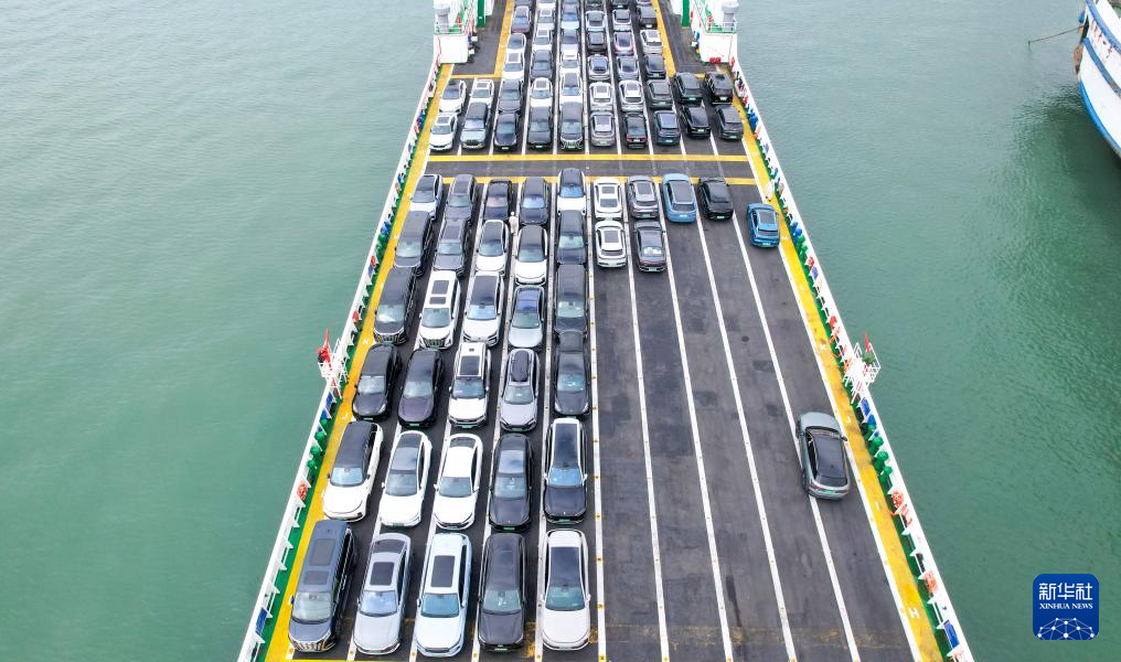 1月30日,在海南省海口市秀英港,新能源汽车在“绿源二号”上有序停放。新华社记者 杨冠宇 摄