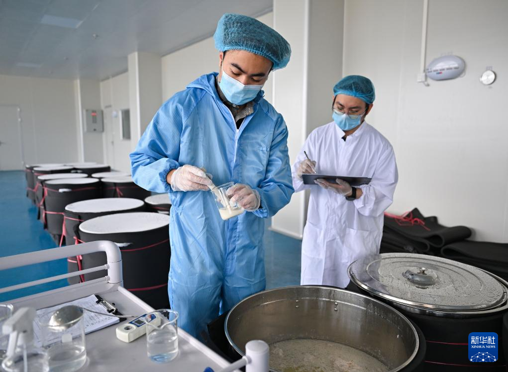 1月28日,文昌溪北邦兴食品科技有限公司糟粕醋加工厂的工作人员对糟粕醋进行采样检测。新华社记者 郭程 摄