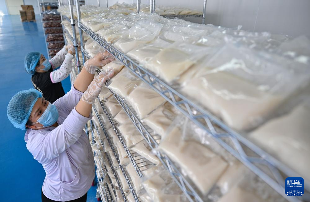 1月28日,文昌溪北邦兴食品科技有限公司糟粕醋加工厂的工作人员对袋装糟粕醋进行降温风干。新华社记者 郭程 摄