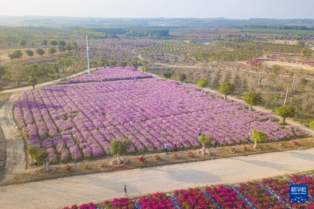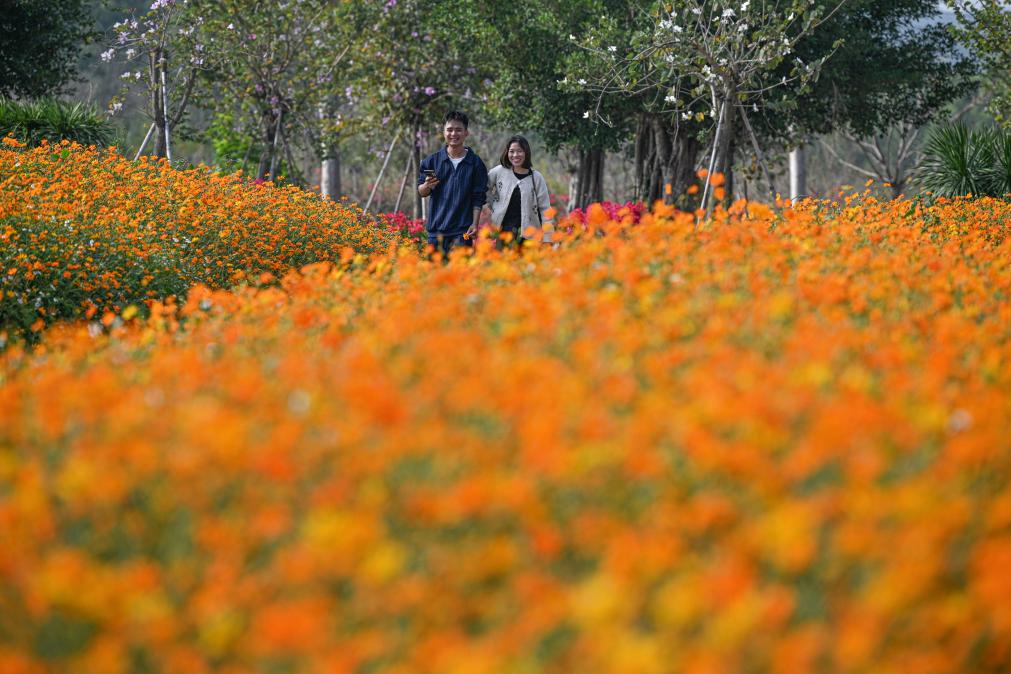 近日,在位于海南省昌江黎族自治县的聚源花卉博览园内,格桑花、硫华菊、三角梅等花卉竞相绽放,吸引了大批游客徜徉花海、打卡拍照,在诗意田园中邂逅烂漫春天。