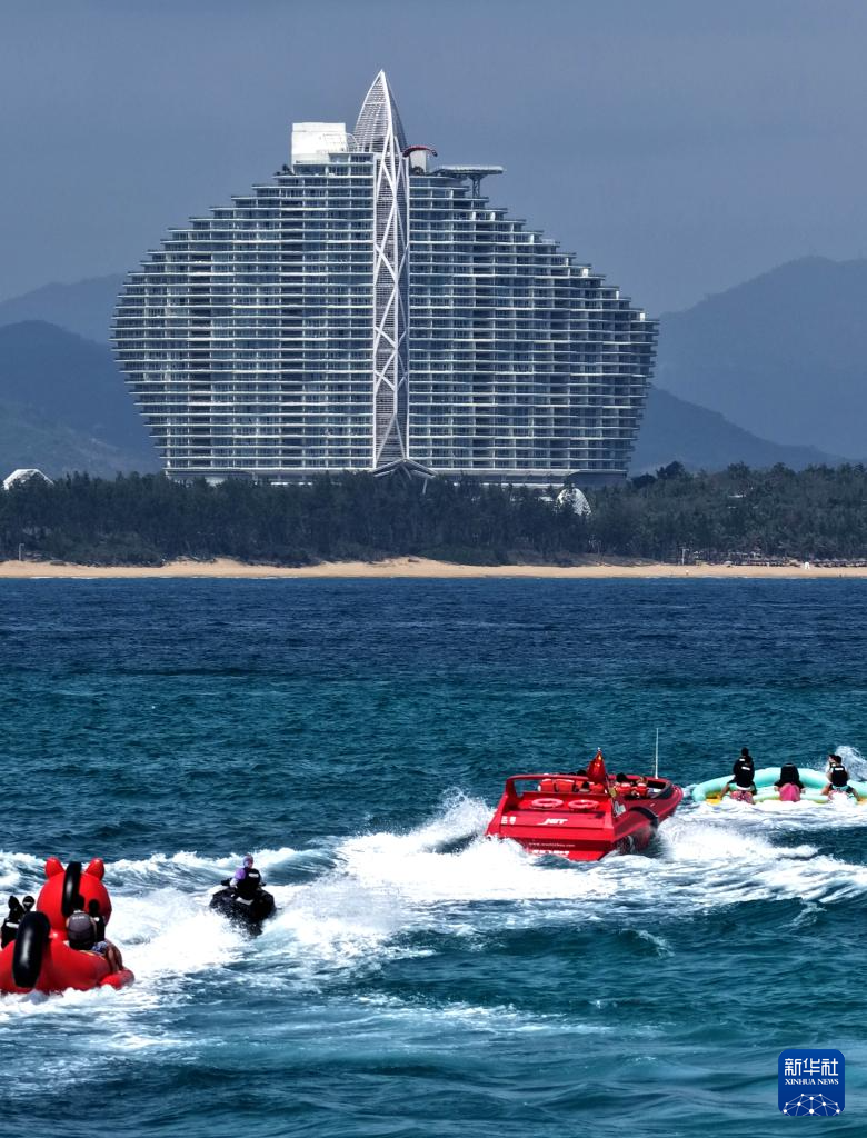2月22日,游客在三亚市蜈支洲岛体验水上项目(无人机照片)。新华社记者 赵颖全 摄
