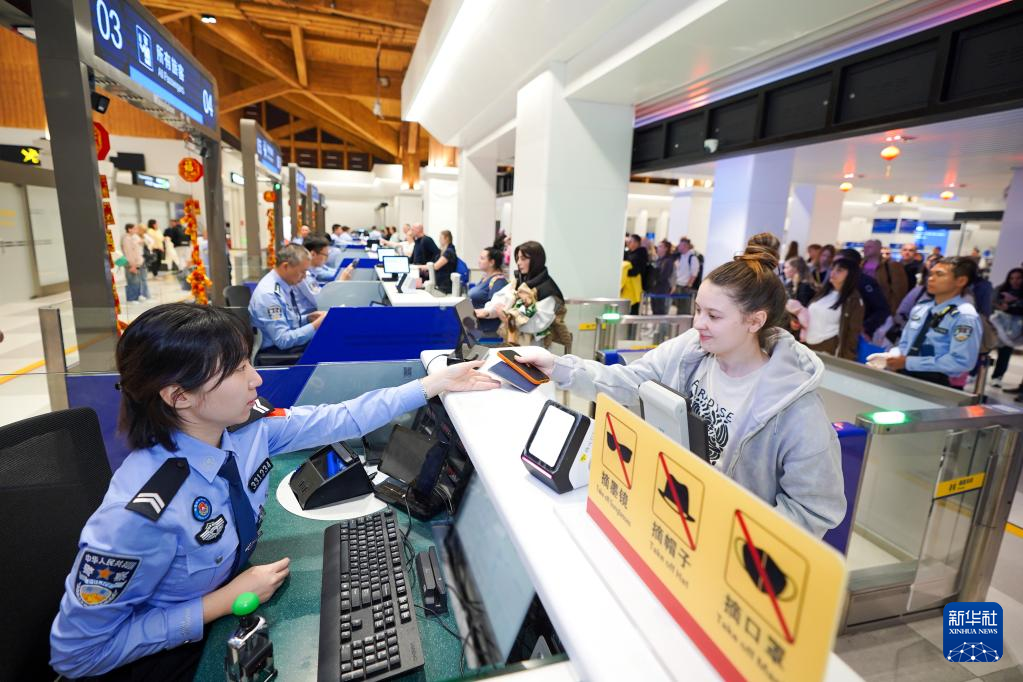 2月16日,美兰边检站执勤民警为旅客办理边检手续。新华社发(孙浩戎 摄)
