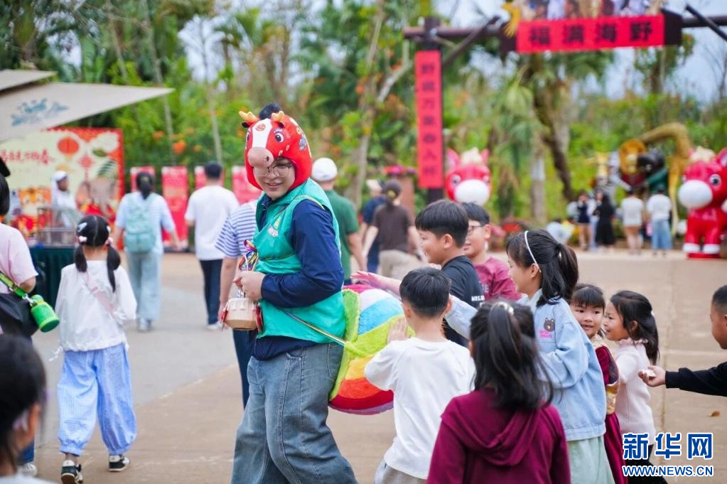 春节期间,海南热带野生动植物园工作人员和小朋友互动。