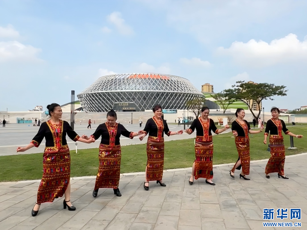 东方市霞光合唱团成员在东方市文化广场练习民歌合唱。新华网发