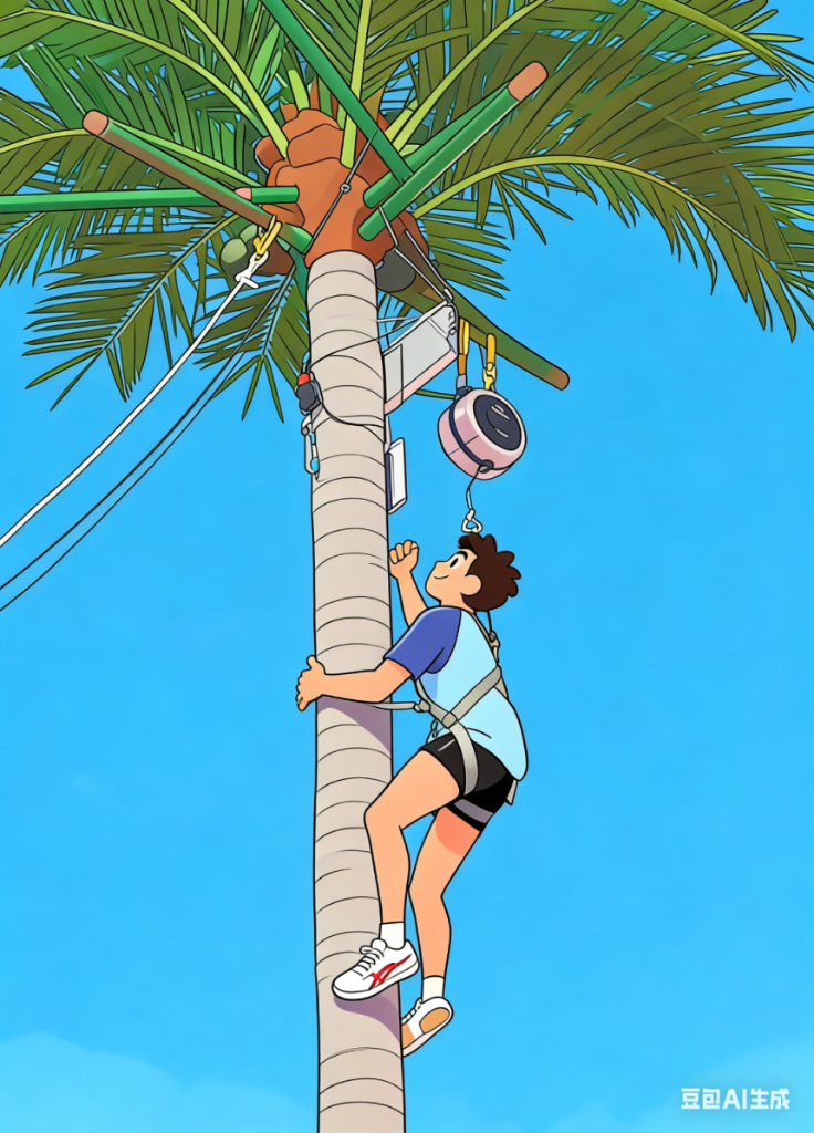 双手环抱椰树干,两脚一蹬
