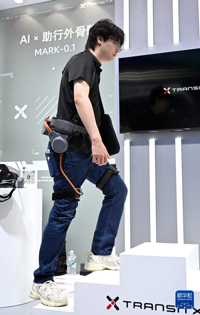 4月14日,参观者在第六届消博会现场体验一款AI助行外骨骼。新华社记者 郭程 摄