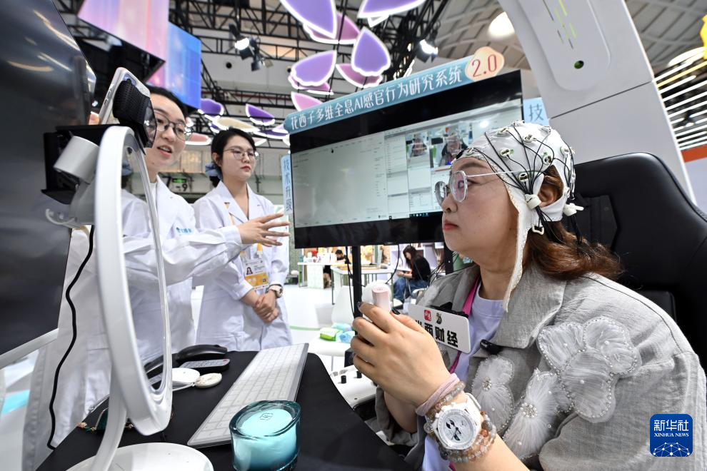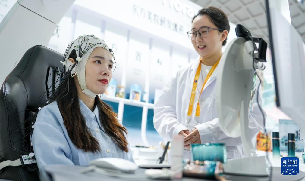 4月14日,展商在消博会现场展示美妆多维全息AI感官行为研究系统。新华社记者 杨冠宇 摄