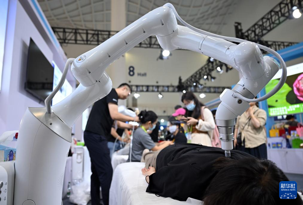 4月14日在第六届消博会现场拍摄的一款智能按摩机器人。新华社记者 郭程 摄