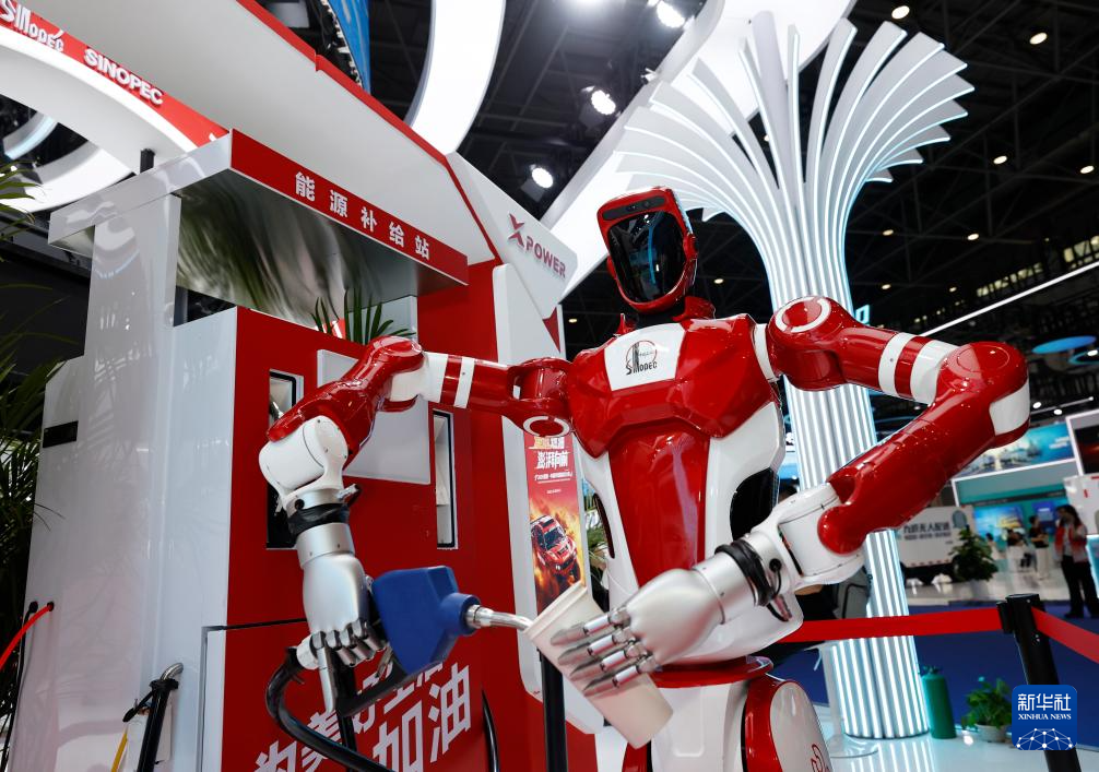 4月14日,在第六届消博会科技消费展区,中国石化展台展示机器人加油。新华社记者 高静 摄