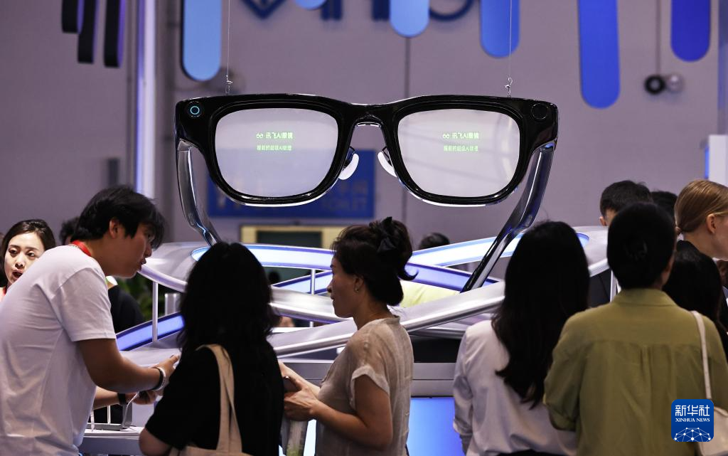 4月14日,观众在第六届消博会科技消费展区了解科大讯飞的AI眼镜产品。新华社记者 杨冠宇 摄