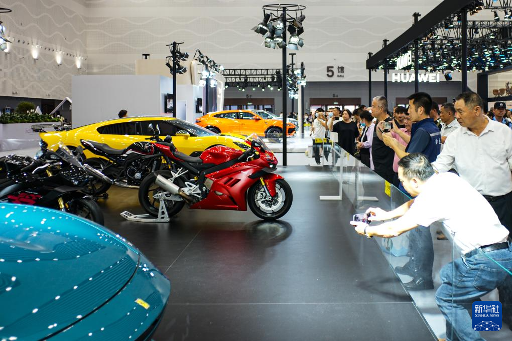 4月17日,在第六届消博会免税与高端精品展区,人们在展出的张雪机车前驻足拍照。新华社记者 辛悦卫 摄