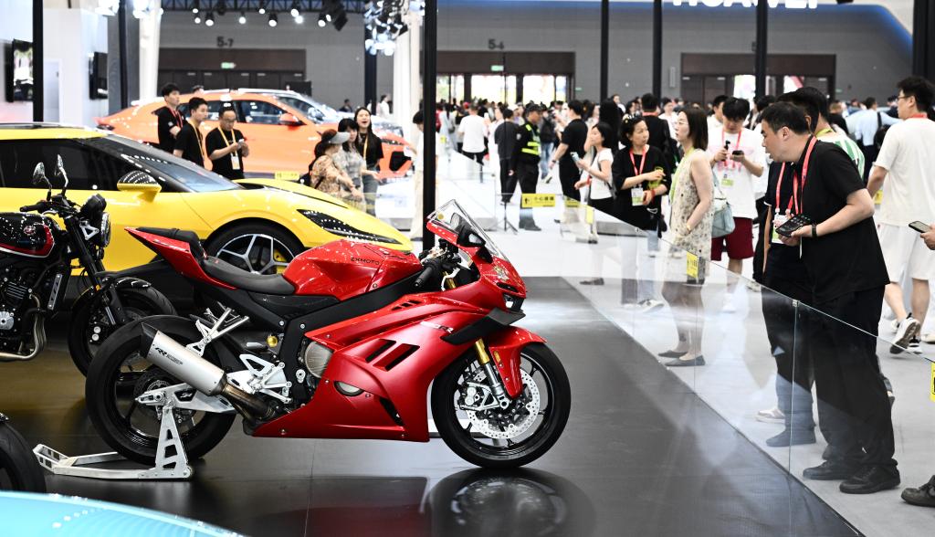 观众在第六届消博会主会场参观张雪机车。新华社记者 杨冠宇 摄
