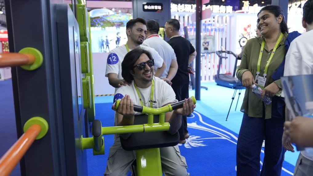 参展观众在体验消博会上一款运动器材。(受访者供图)